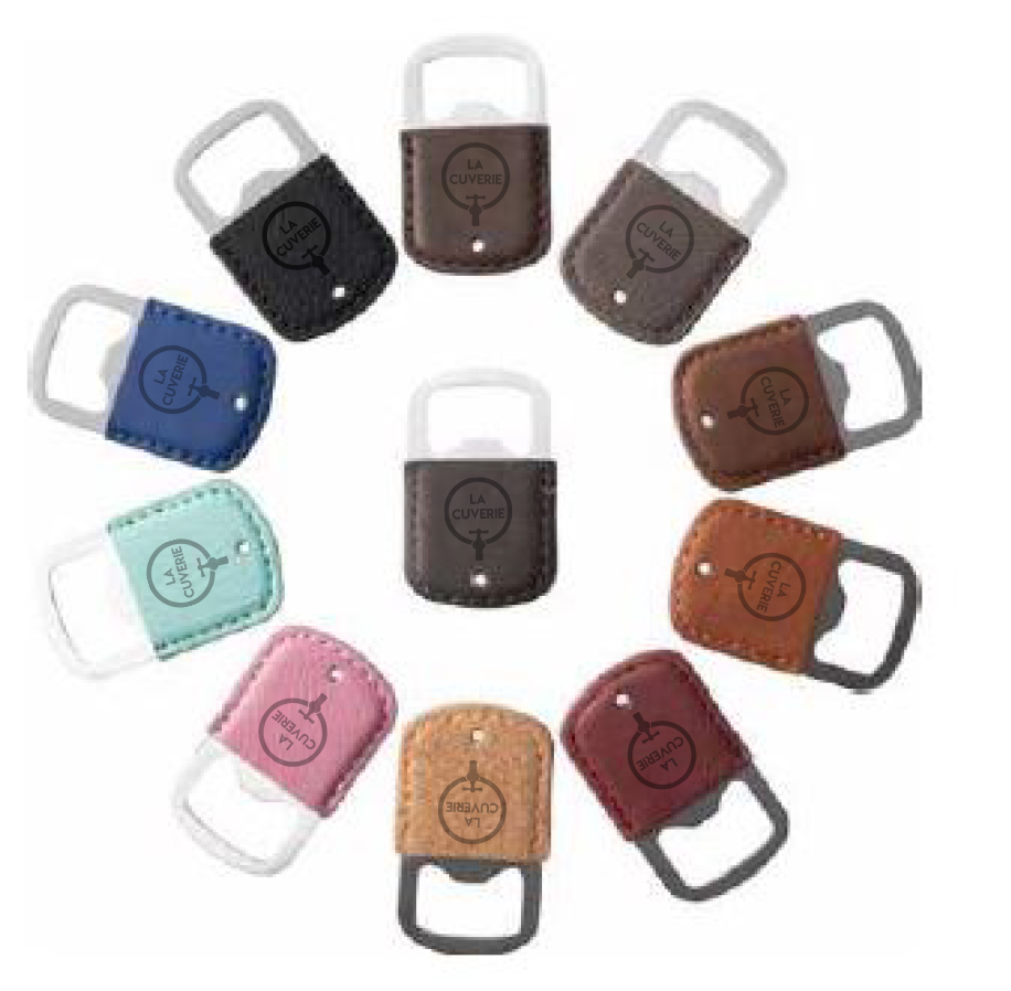 Ouvre bouteille en cuir gravure. Changement de lot: 30$ de frais de set up. Les impressions sont réalisées en sublimation. Pour les gravures sur les items, des frais de montage pour vectorisation du produit peuvent être appliquer. Les prix peuvent être sujet à changement sans préavis.